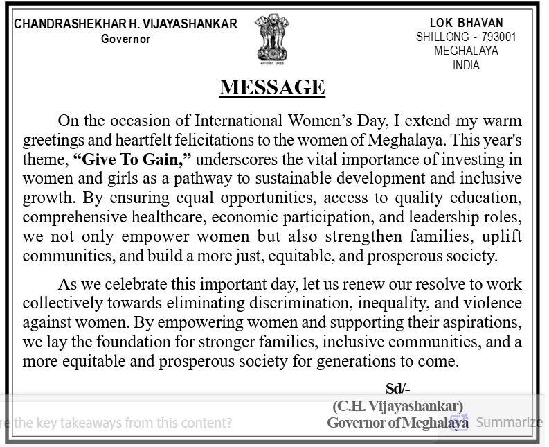 SHILLONG, NOV 18: Meghalaya Governor CH Vijayashankar on Tuesday emphasized the need for vigilance in safeguarding national integrity. He noted that threats to unity can[more...]